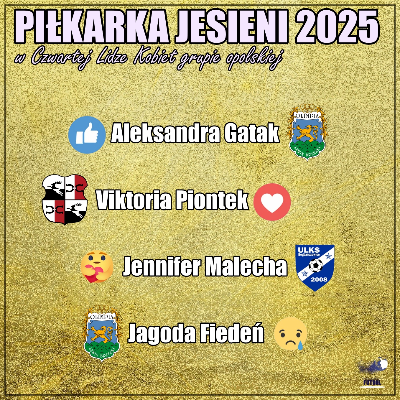 Aleksandra Gatak została zwyciężczynią naszego plebiscytu na najlepszą piłkarkę rundy jesiennej IV Ligi – grupy opolskiej. Czytelnicy TylkoKobiecyFutbol.pl wskazali zawodniczkę Olimpia Lewin Brzeski jako najbardziej wyróżniającą się postać pierwszej części sezonu.
