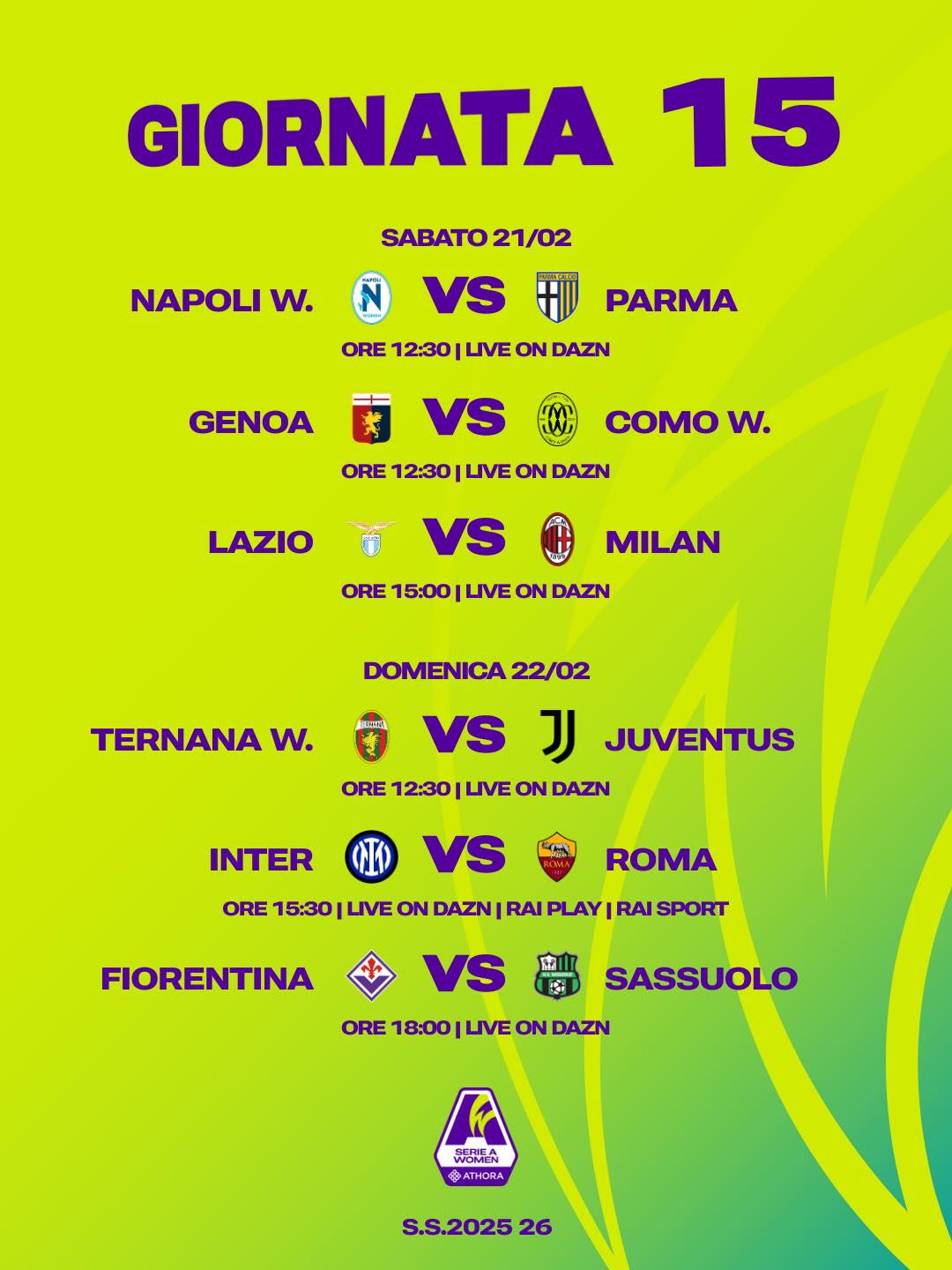 Inter – Roma (15:30): Absolutny hit kolejki, który będzie można śledzić na antenach DAZN. Na Arena Civica druga drużyna podejmie lidera. Różnica między zespołami wynosi trzy punkty i po tym meczu może wzrosnąć do sześciu, utrzymać się, bądź zniwelować do zera. Inter, prowadzony przez trenera Piovaniego, celuje w dwunaste zwycięstwo z rzędu we wszystkich rozgrywkach (wliczając w to Coppa Italia Women, gdzie obie ekipy znów się spotkają w walce o finał). W Europie tylko Bayern Monachium i FC Barcelona mogą pochwalić się podobnie imponującą serią zwycięstw. Indywidualne pojedynki zapowiadają się fascynująco. Zmierzą się ze sobą zawodniczki mające po 9 trafień na koncie: Wullaert z Interu (która ma również 9 asyst) oraz Giugliano z Romy. Obie tracą tylko jednego gola do liderującej w klasyfikacji strzelczyń Martiny Piemonte. Historia i statystyki stoją jednak po stronie Romy. „Giallorosse” wygrały pierwsze starcie z Interem aż 3:0 (gole zdobywały Pandini, Dragoni i właśnie Giugliano). Co więcej, w dwóch z trzech przypadków, gdy Roma po 15 spotkaniach miała na koncie 33 punkty lub więcej, ostatecznie sięgała po mistrzostwo (w latach 2023 i 2024).